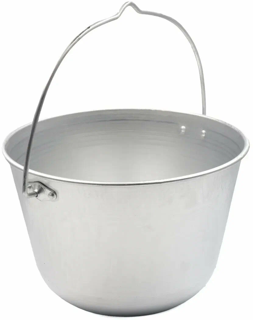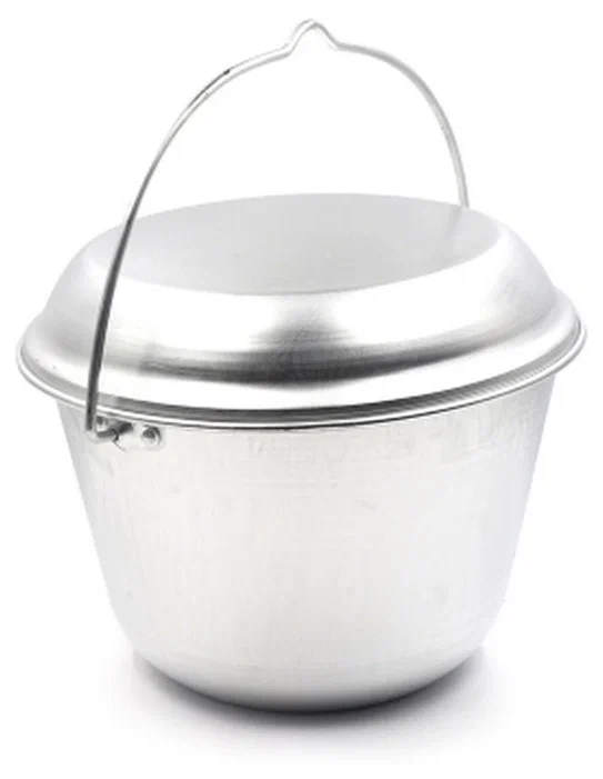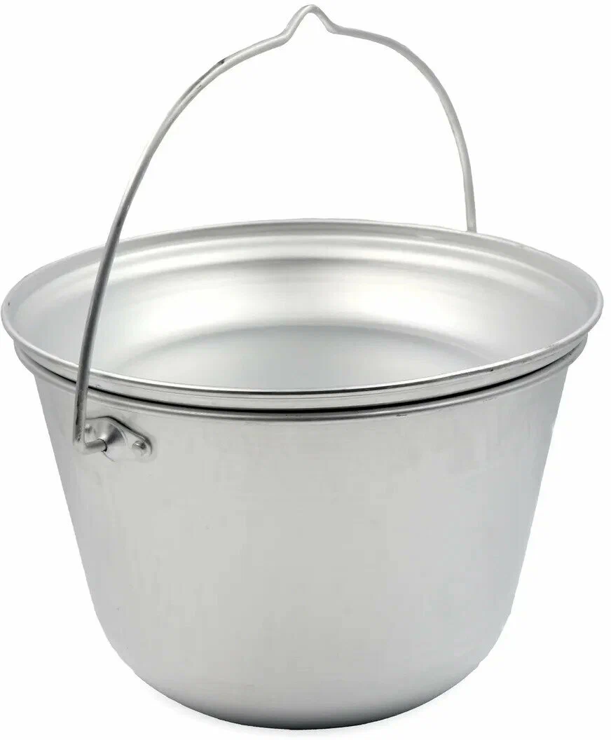 Котелок костровой PF-CWS-P98 от бренда Следопыт выполнен из пищевого алюминия, имеет объём 6 литров и обладает удобной в применении круглой ручкой с петелькой под треногу для подвешивания.