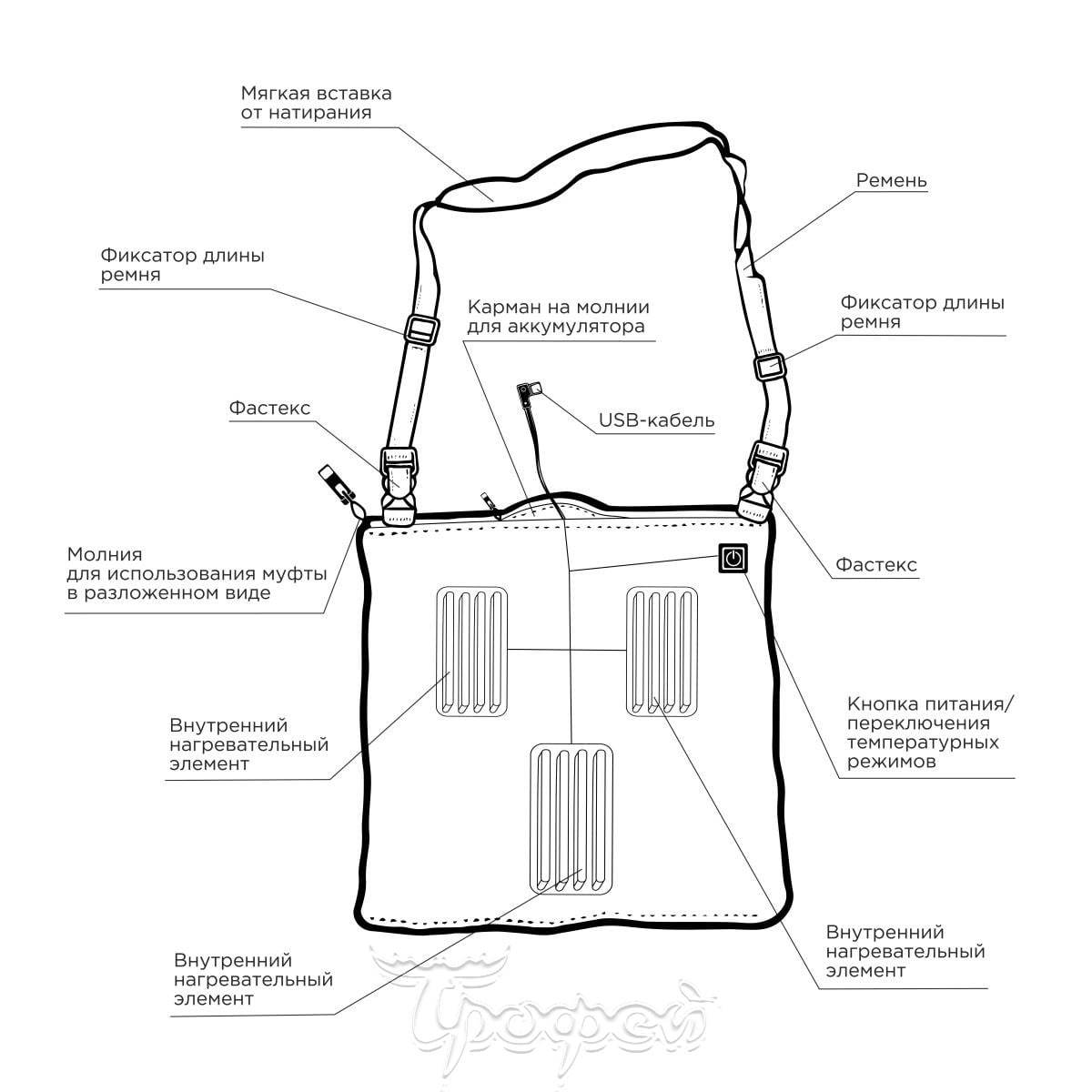 • Встроенные нагревательные элементы позволяют регулировать температуру в трех режимах 45°C, 55°C и 65°C. Нагревательные элементы подключаются через USB к Power Bank (Power Bank не входит в комплектацию, рекомендуется использовать его с емкостью от 10 000 mAh и более). Максимальная температура внутреннего нагрева муфты при распределении тепла - 45°C.